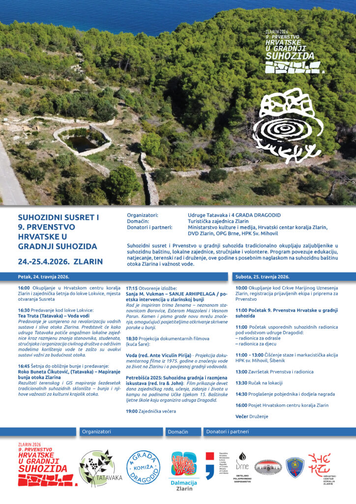Suhozidni susret i Prvenstvo u gradnji suhozida tradicionalno okupljaju zaljubljenike u suhozidnu baštinu, lokalne zajednice, stručnjake i volontere. Program povezuje edukaciju, natjecanje, terenski rad i druženje, ove godine s posebnim naglaskom na suhozidnu baštinu otoka Zlarina i važnost vode.